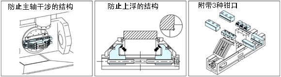 ■通过避开主轴的干涉的加高的结构设计,工件夹持位置变高,最适合作为刀具干涉少的5轴加工机床以及复合机床的专用平口钳 ■半圆球的链接防止工件上浮 ■可以选用加工内容最合适的钳口 ■不适合进行对中心精度有要求的加工工作