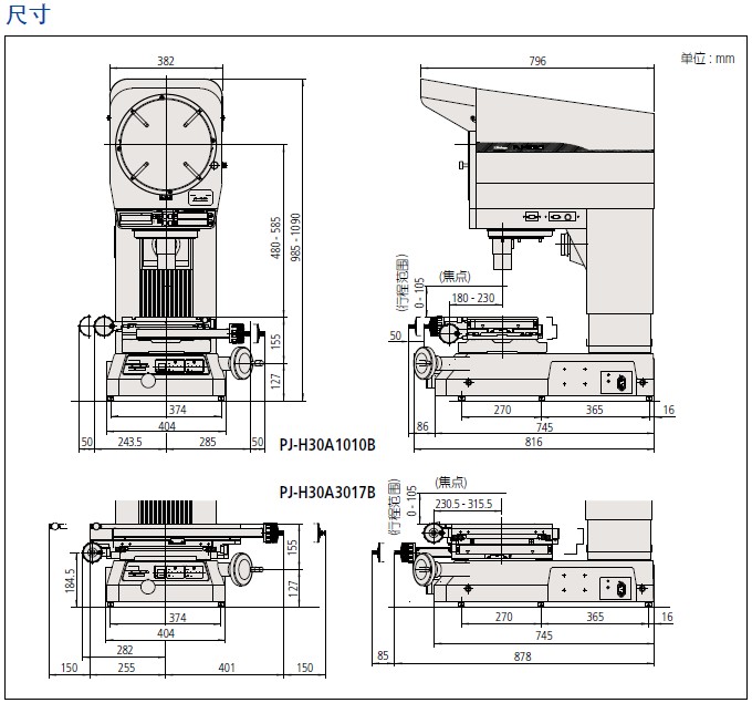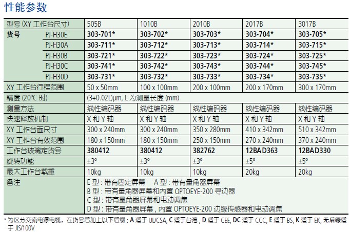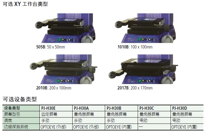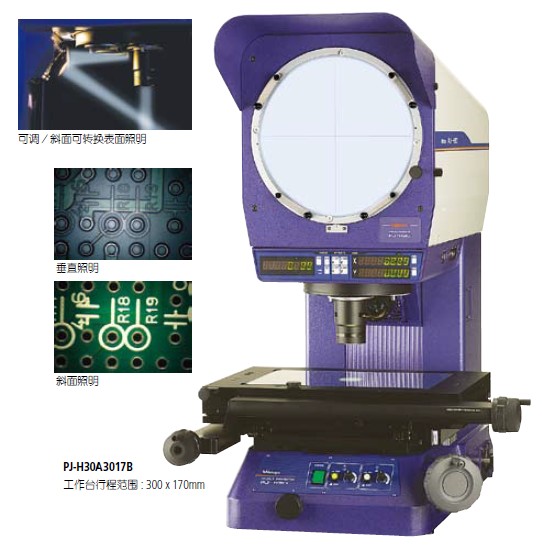 PJ-H30303 系列 — 投影仪特点• 新型带有高NA 镜头的光学系统在表面照明时可呈现更明亮、更清晰的屏幕图像。• 三镜头安装标配一个10X 镜头,此外有四种投影镜头 (5X, 20X, 50X, 100X) 可供选择。通过分离轴向移动,使XY 工作台在垂直方向上移动更稳定,PJ-H30 系列投影仪具有(3+0.02L)μm 的高测量精度;可通过手动或电动上、下调节屏幕微分头实现聚焦。电动聚焦(PJ-H30D 型) 具有更高的操作性能。