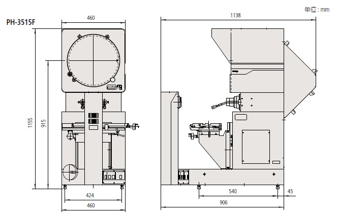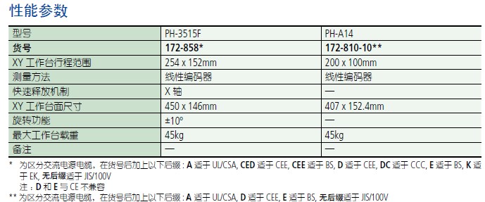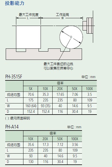PH-3515F, PH-A14172 系列 — 投影仪特点• 采用水平光学系统得台式投影仪。• 适于螺纹间距测量——工件旋转时,图像不会产生毛边或扭曲。• 日光屏显示正像* (*倒像:PH-A14)。